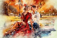 Mijn kunstwerk 'Eerste afspraakje' brengt een ontroerend moment tot leven, waarin twee jonge mensen hun allereerste liefdesafspraakje ervaren. Dit tafereel speelt zich af in een park, waar ze samen op de rand van een fontein zitten. De details in hun kleding onthullen dat dit moment zich alweer enige tijd geleden heeft afgespeeld.