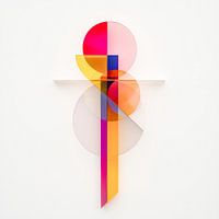Dit werk is een harmonieuze samensmelting van licht, geometrie en kleur. De kundige rangschikking van doorschijnende cirkels en verticale elementen creëert een bijna gewichtloze compositie die schommelt tussen evenwicht en beweging. De intense kleuren - magenta, geel, oranje en blauw - smelten door overlapping samen tot zachte nuances…
