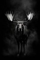 Een majestueuze eland verschijnt uit een mysterieuze mist, waarbij zijn imposante geweihoorns indrukwekkend opvallen. De sfeervolle zwart-wit esthetiek geeft het beeld een dramatische diepte die de aandacht trekt. Ideaal voor een woonkamer, het brengt de natuur binnen je vier muren en creëert een indrukwekkende conversatiestarter.