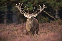 Een edelhert op de heide toont zijn indrukwekkende gewei en poseert elegant met zijn neus in de lucht.