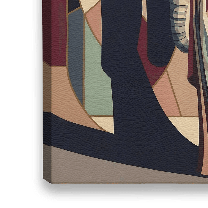 Dit stuk, getiteld *Elephantine Elegance*, is een viering van Art Deco raffinement en het samenspel van kracht en gratie. Centraal staat de moderne muze - een evenwichtige, zelfverzekerde vrouw gedrapeerd in een vloeiende jurk versierd met geometrische patronen. Haar kleding weerspiegelt een harmonie van gedempte tinten en gedurfde…