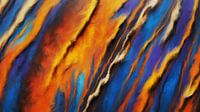 Levendige oranje, blauwe en bruine kleuren wervelen samen in een dynamisch en abstract patroon dat lijkt op stromende vloeistof of gesmolten lava. De levendige tinten contrasteren scherp en roepen een gevoel van beweging en energie op in de compositie.