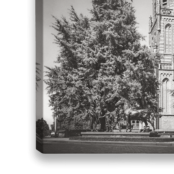 Sculptuur Paardenhandel van Marcus Ravenswaaij uit 1984, aan de Dorpsstraat in Elst, met op de achtergrond de Grote of St. Maartenskerk.