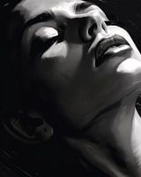 expressief zwart-wit portret van een persoon in een staat van overgave of diepe contemplatie. De krachtige contrasten tussen licht en schaduw accentueren de gelaatstrekken en geven het portret een dramatisch en emotioneel geladen karakter. De subtiele lichtval op het gezicht en de gesloten ogen suggereren een moment van introspectie of vervoering.