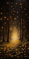Een digitaal schilderij van een mysterieus donker bos met vuurvliegjes. Dit kunstwerk heeft een langwerpige smalle vorm, waardoor het uitstekend geschikt is om de hoogte van een ruimte te benadrukken.