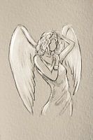 Deze engel is getekend op aquarel papier. De textuur van het papier zie je goed terug in de print. De engel is uitgewerkt met een white wash effect. Deze witte laag over de vleugels en hooglichten laat de engel naar voren komen. De engel heeft een hand in haar haren en een andere hand onder haar gezicht.