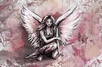 Een kleurig kunstwerk van een engel in bordeaux rood, roze en grijze tinten.