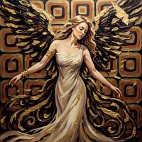 Deze prachtige engel heeft vleugels van goud. Dit kunstwerk heeft een chique stijl en is rijk van textuur. De warme kleuren van de achtergrond passen goed bij de lichte cremekleur van haar zachte jurk. Een spiritueel kunstwerk met een chique uitstraling.