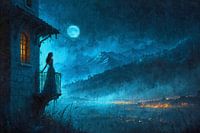 Mijn digitaal schilderij "Enjoying the midnight view" toont een betoverende scène waarin een jonge vrouw op haar balkon staat en geniet van het uitzicht in de nacht. Het balkon biedt een panoramisch zicht op de bergen, een schitterend verlicht bergmeer en een schilderachtig bergdorp.
