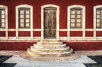Entreedeur en symmetrie bij de vuurtoren El Toston op het Spaans-Canarische Eiland Fuerteventura nabij El Cotillo in het Noordwestelijke deel.