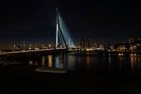 Nachtfoto van de Erasmusbrug te Rotterdam met op de achtergrond de mooie verlichte skyline van de stad en reflecties in het water.