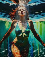 Op dit fascinerende schilderij drijft een vrouw gracieus onder water, haar ogen zachtjes gesloten voor het oppervlak erboven. Haar haar vloeit vrij en creëert een etherisch, bijna gewichtloos effect dat bijdraagt aan de serene sfeer van de scène.