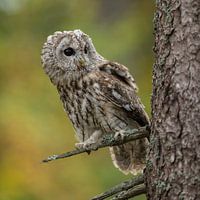 Tawny Owl / Waldkauz ( Strix aluco ) perched on a dry branch of a tree, bright eyes, watching curious, attentively, autumnal background, golden October, Europe.