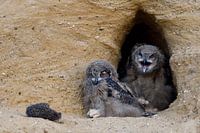 Eurasian Eagle Owls ( Bubo bubo ), quarreling chicks with the carcass of a hedgehog in front of their nest burrow, funny, wildlife, Europe.