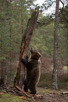 European Brown Bear / Europaeischer Braunbaer ( Ursus arctos ), playful young cub, standing on hind legs in front of an old tree, looks cute and funny, Europe.