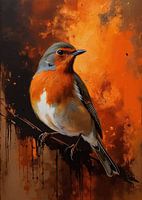 In dit op clair-obscur geïnspireerde schilderij gloeit het Europese Roodborstje warm op, zijn rode borst verlicht als een baken tegen een omhullende schaduw. Schilderachtige texturen verzachten de achtergrond, terwijl spettereffecten speelse energie brengen en de levendige charme van het vogeltje weerspiegelen. De sterke contrasten…