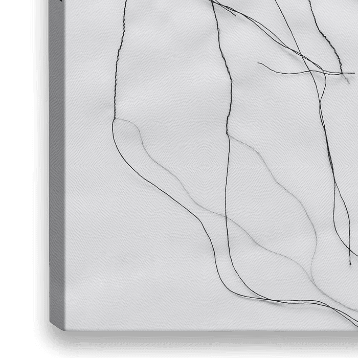 Een figuratief zwart-'wit' werk van zwart draad op transparante stof.