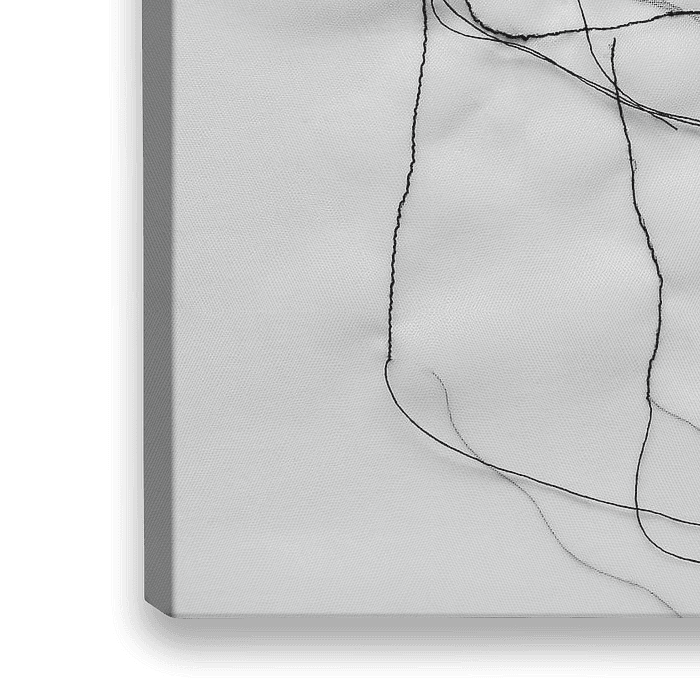 Een figuratief werk van zwart draad op wit transparant. Een innige omhelzing, de losse draden van het werk geven het beeld vrijheid & beweging.