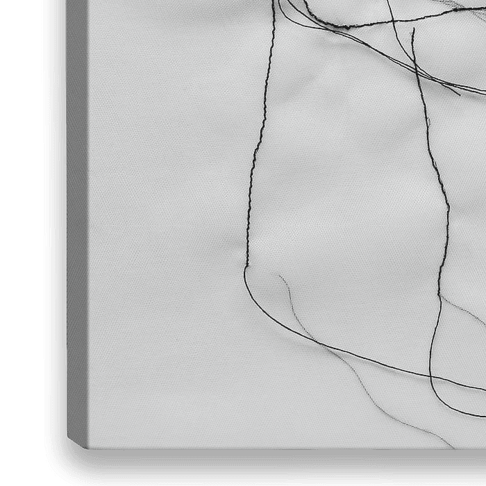 Een figuratief werk van zwart draad op wit transparant. Een innige omhelzing, de losse draden van het werk geven het beeld vrijheid & beweging.