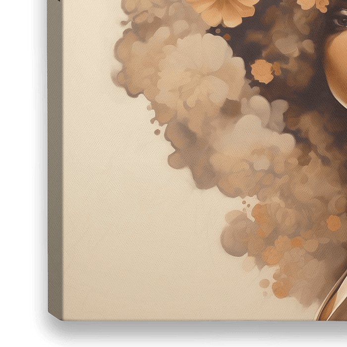 Een portret van een Afro-Amerikaanse vrouw met bloemen in haar kapsel. Beige en warme tinten.