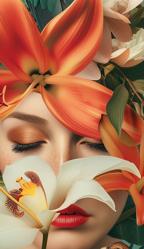 Vrouwelijk portret verweven met de exotische pracht van de natuur. De compositie is een harmonieuze samensmelting van flora en fauna, met opvallende oranje bloemen die het beeld domineren en de zachtheid van het vrouwengezicht accentueren. Een papegaai met levendige kleuren en een kleine vogel voegen een dynamische en levendige toets toe aan het geheel.