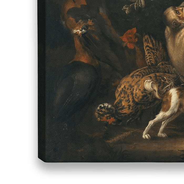 Koop Exotische vogels, een pauw met een aap en honden in een landschap, Antoine Monnoyer als reproductie op canvas, aluminium dibond, (ingelijste) fotoprint, behang en ArtFrame, op maat geprint in Fine-Art kwaliteit.