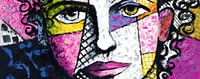 Eye Catching Vibe - Dit kleurrijke vrouw schilderij toont een vrouw met krullend haar, omringd door levendige kleuren zoals roze, geel en groen, waarbij haar expressieve ogen en lippen de aandacht trekken in een abstracte stijl.