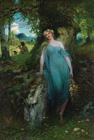 Een nymph is een Griekse halfgodin en daimon die in de natuur leeft, en vaak gebonden is aan een bepaalde plek of plantensoort. Deze vrouw staat in een jurk in blauw in het bos. Op de achtergrond speelt een man op een fluit aan de rand van een groen veld in het landschap met bergen op de achtergrond.