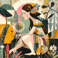 Dit abstracte schilderij van een fee bij een paardenbloem is een ware eyecatcher voor wie een interieur een verfijnde en eigentijdse uitstraling wil geven. Met een mix van geometrische vormen, levendige kleuren en expressieve details is dit kunstwerk ideaal voor interieurstylisten die zoeken naar kunst die zowel modern als tijdloos is.De compositie combineert zachte roze tinten en perzikkleurige nuances met diepe smaragdgroene vlakken, warme goudaccenten en subtiel wit. Deze kleurharmonie maakt het schilderij veelzijdig inzetbaar: van een minimalistisch Scandinavisch interieur tot een luxe urban-chic setting. De fee als centraal motief symboliseert elegantie en balans, en tilt elke ruimte naar een hoger niveau.