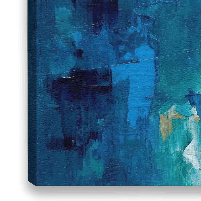 Modern abstract kunstwerk met lagen structuurverf in tinten blauw en wit, wat een impressionistisch effect creëert. De achtergrond is een diep oceaanblauw, met verspreide penseelstreken die diepte toevoegen aan de compositie. Tussen deze lagen ligt een paletmesschildering die textuur en beweging toevoegt. Dit kunstwerk symboliseert…