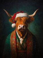 Dit kunstwerk toont een trotse Schotse hooglander die rustig naar voren kijkt. De warme oranje vacht komt prachtig naar voren tegen de donkere achtergrond. De kerstmutst met Schotse ruit voegt een speelse winterse sfeer toe. De kleding is rijk versierd met groene en rode tinten die samen een luxe uitstraling vormen. De gouden patronen…