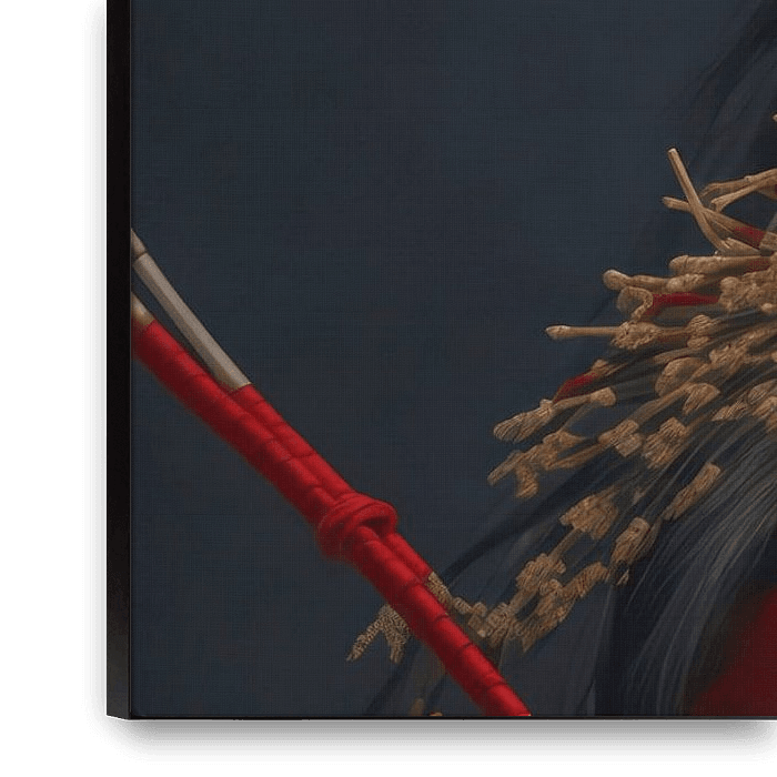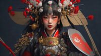 Female Samurai in full armor in the colors red and bronze with flowers in her helmet.