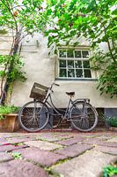 Kleurrijk straatbeeld in 's-Hertogenbosch, Noord-Brabant. Een fiets met een houten krat aan een grote ketting staat onder het raam in de Schilderstraat in de binnenstad.