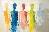 Figuren Kleuren | Abstracte Mensen in Pastel - In dit abstract schilderij zie je vijf figuren in verschillende kleuren, waarbij elke figuur een andere pastel tint heeft zoals geel, blauw en groen, wat een vrolijke en moderne uitstraling geeft.