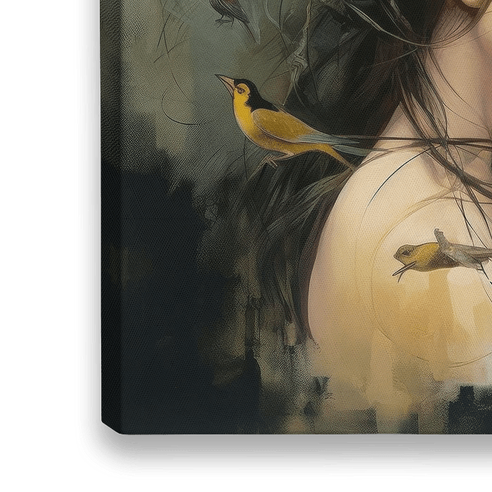 Fine art portret "Bird's nest". Bijzonder portret van een jonge vrouw met een groot vogelnest met vogels op haar hoofd. Dit werk is onderdeel van een serie. om de andere werken te zien typ je in de zoekbalk "Bird's nest". Advies: laat dit werk op dibond, aluminium of artframe afdrukken, dan komt het het best tot haar recht. Met dit werk haal je echt iets bijzonders in huis!