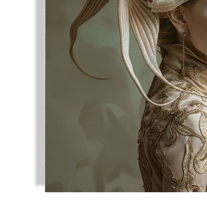Prachtig klassiek portret van een dame met een visachtig hoofddeksel. Deze hoed heeft een staande vin en een grote vis die naar achteren kijkt. Een heel bijzonder kunstwerk waar je naar blijft kijken.