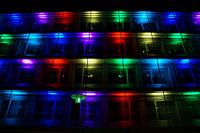een gebouw met meerdere verdiepingen, waarvan de gevel is verlicht door kleurrijke lichten. Elk verdiepingen heeft een reeks ramen, en de lichten creëren een levendig patroon van rode, groene, blauwe en paarse tinten over de buitenkant van het gebouw. De lichten zijn in…
