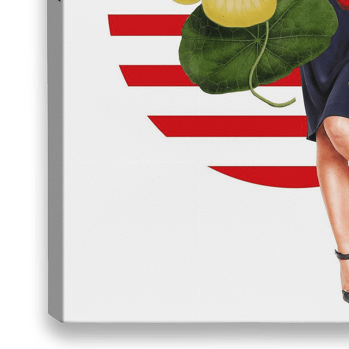 Haar benen en één hand met een ring zijn zichtbaar, wat een speelse en stijlvolle uitstraling geeft. De achtergrond wordt gevormd door een zwart-wit gestreepte cirkel.