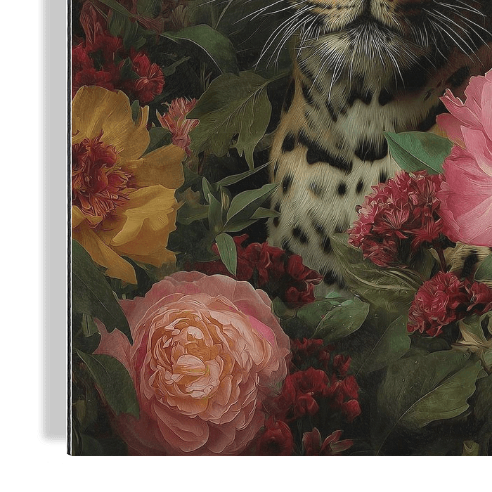 'Floral Leopard' toont een luipaard verscholen tussen weelderige bloemen. De intense blik en het realistische detail geven het dier een krachtige aanwezigheid, terwijl de rijke florale compositie zorgt voor zachtheid en elegantie. De combinatie van wilde energie en verfijnde natuur maakt dit werk zowel spannend als harmonieus.