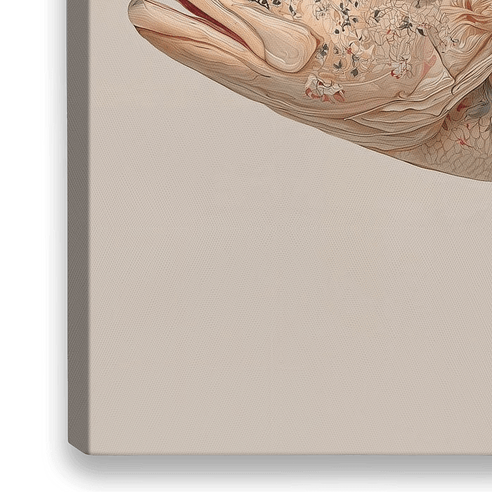 Een illustratie van een vis artistiek gecombineerd met een groot levendig boeket bloemen. De algehele compositie combineert aquatische en florale elementen in een harmonieuze, surrealistische stijl.