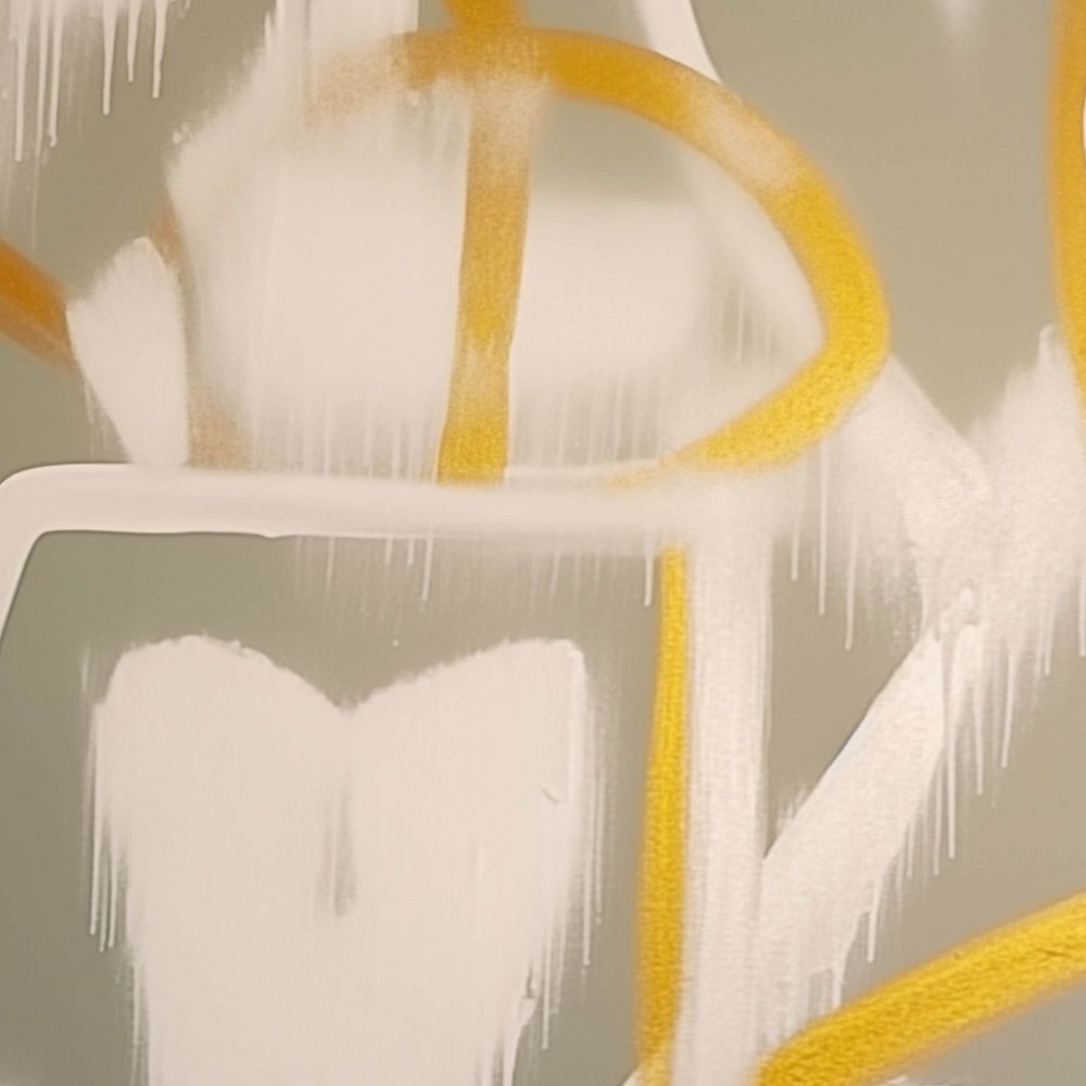 Abstracte compositie die speelt met de combinatie van graffiti-achtige elementen en zachte pastelkleuren. De vloeiende lijnen en vormen in tinten van wit, grijs en goud op een grijsachtige achtergrond creëren een gevoel van beweging en spontaniteit. Centraal in het stuk is een ongedefinieerde vorm die enigszins doet denken aan een tand of een hart, omlijst door onregelmatige, overlappende cirkels en lijnen.