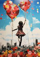 Mixed media afbeelding van een meisje zwevend in de lucht aan ballonnen. Een droom die werkelijkheid wordt. Zwevend tussen de wolken in de blauwe hemel vanuit kleurrijke bloemen met de stad die verrijst op de achtergrond. Passend bij diverse stijlen en trends. Zwartwit en kleurrijk.