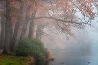 De mist rond de vijver geeft de omgeving een schilderachtige sfeer.