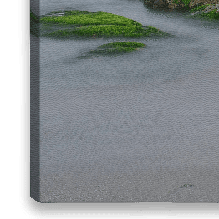 Rustieke avondopname van de Franse kust bij Plobannalec-Lesconil (Bretagne). De lange belichtingstijd zorgt voor een rustig wateroppervlak en brengt een rustige sfeer in de foto. Het groene zeewier op de rotsen geven een mooi contrast in kleur.