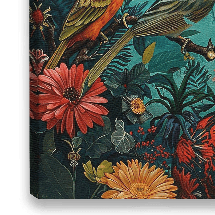 Een levendig en dynamisch olieverfschilderij toont Frida omringd door exotische vogels, bloeiende bloemen en een weelderig landschap. Het kleurenpalet moet gevarieerd zijn, met levendig blauw, rood, groen en geel om de schoonheid in de onmiskenbare stijl van Frida vast te leggen.
