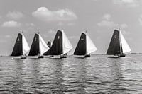 Skûtsjes zeilen voor de wind tijdens de SKS Sprintwedstrijden op het Friese meer De Fluessen bij Elahuizen. Tijdens de sprintwedstrijden wordt er meerdere keren per dag gestart en telkens 1 baan gezeild.