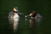 Fuut (Podiceps cristatus), oude vogels voeden hun nakomelingen om de spijsvertering te bevorderen met veren, het gezinsleven, grappig en ontroerend beeld, donkere achtergrond, mooi licht, dieren in het wild, Europa.
