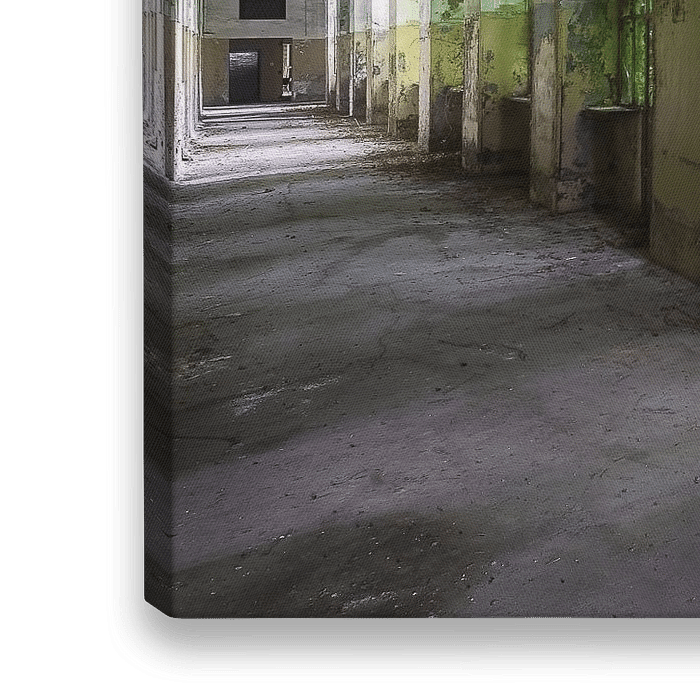 Geweldige gangen in een verlaten Italiaans ziekenhuis met prachtige groene tinten. Door de ramen van de gangen groeien langzaam planten naar binnen. Op de vloer ligt veel stof.