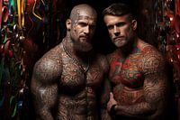 Een explosie van creativiteit en kracht straalt af van deze unieke AI-gecreëerde portretten! Je wordt direct meegezogen in een dynamisch tafereel waar gespierde mannen elkaar ontmoeten in een sfeervolle steeg. De kleurrijke graffiti op de muren vertelt een eigen verhaal, met patronen en beelden die energie en stedelijke rauwheid…