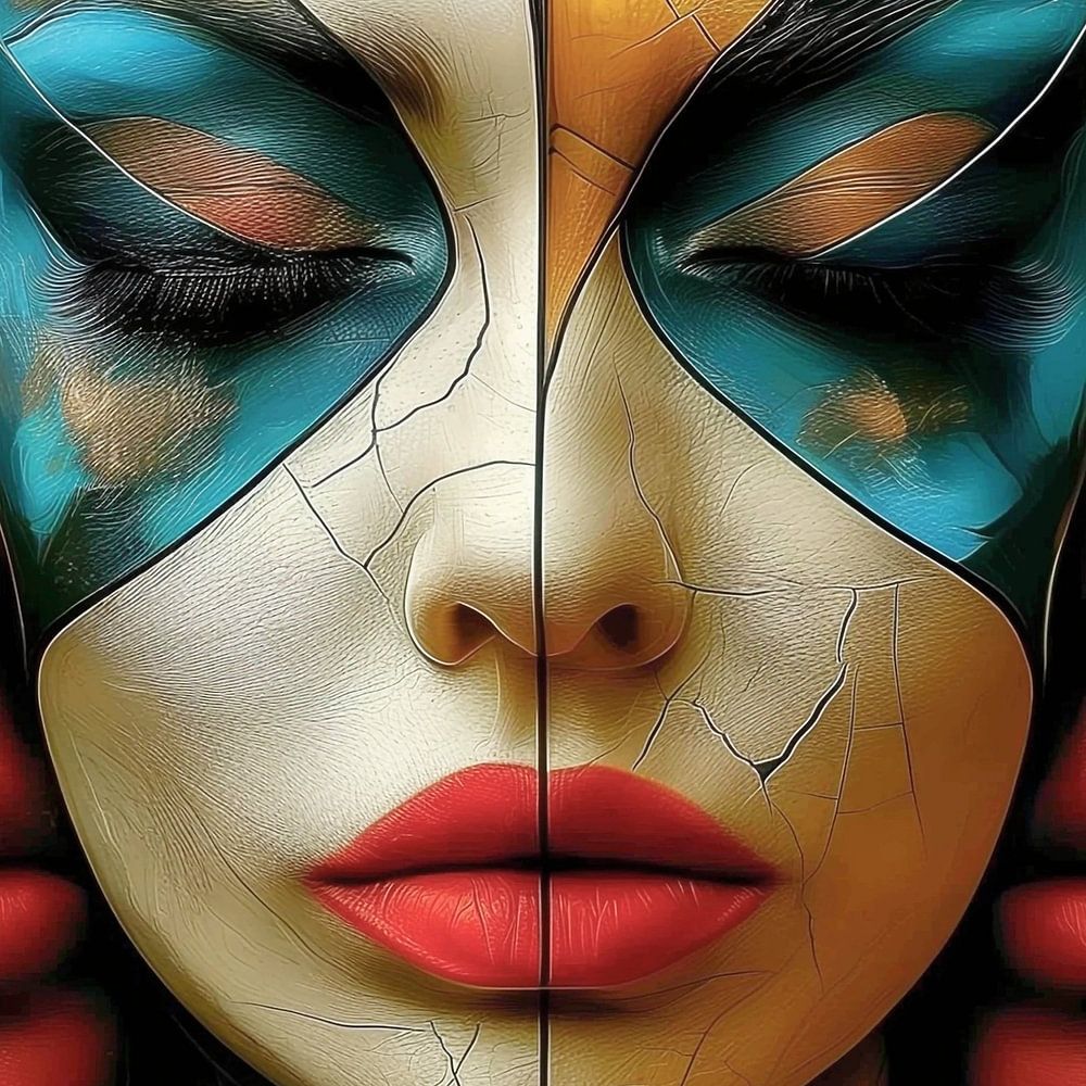 Fascinerende fusie van drie gezichten, samengevoegd tot een symmetrisch vierluik dat rijk is aan kleur en textuur. De gezichten zijn geschilderd met levendige kleuren - rood, geel, blauw en groen - elk vakje toont een andere kleurcombinatie, wat bijdraagt aan de complexiteit van het beeld. De scheuren en gebarsten texturen over de hele compositie suggereren een soort veroudering of een onderliggend verhaal dat uit de kaders breekt.